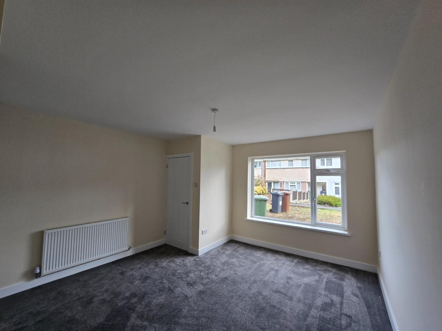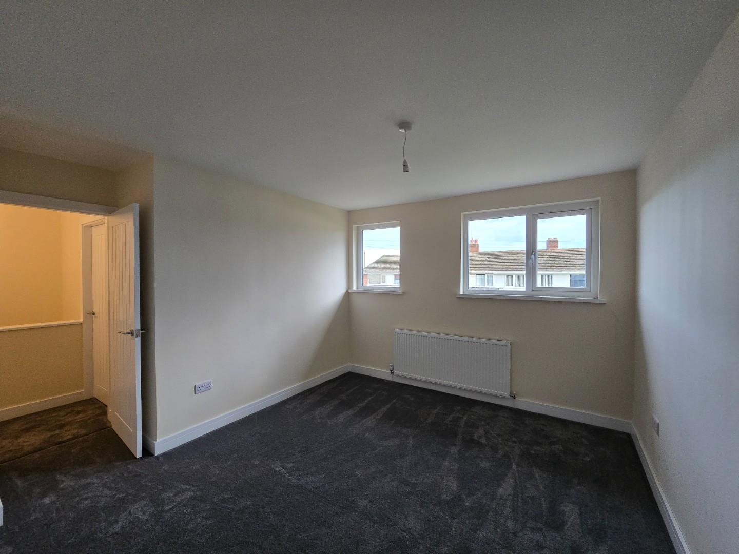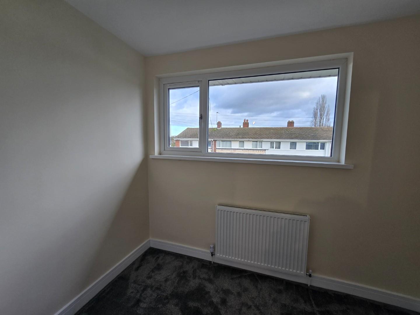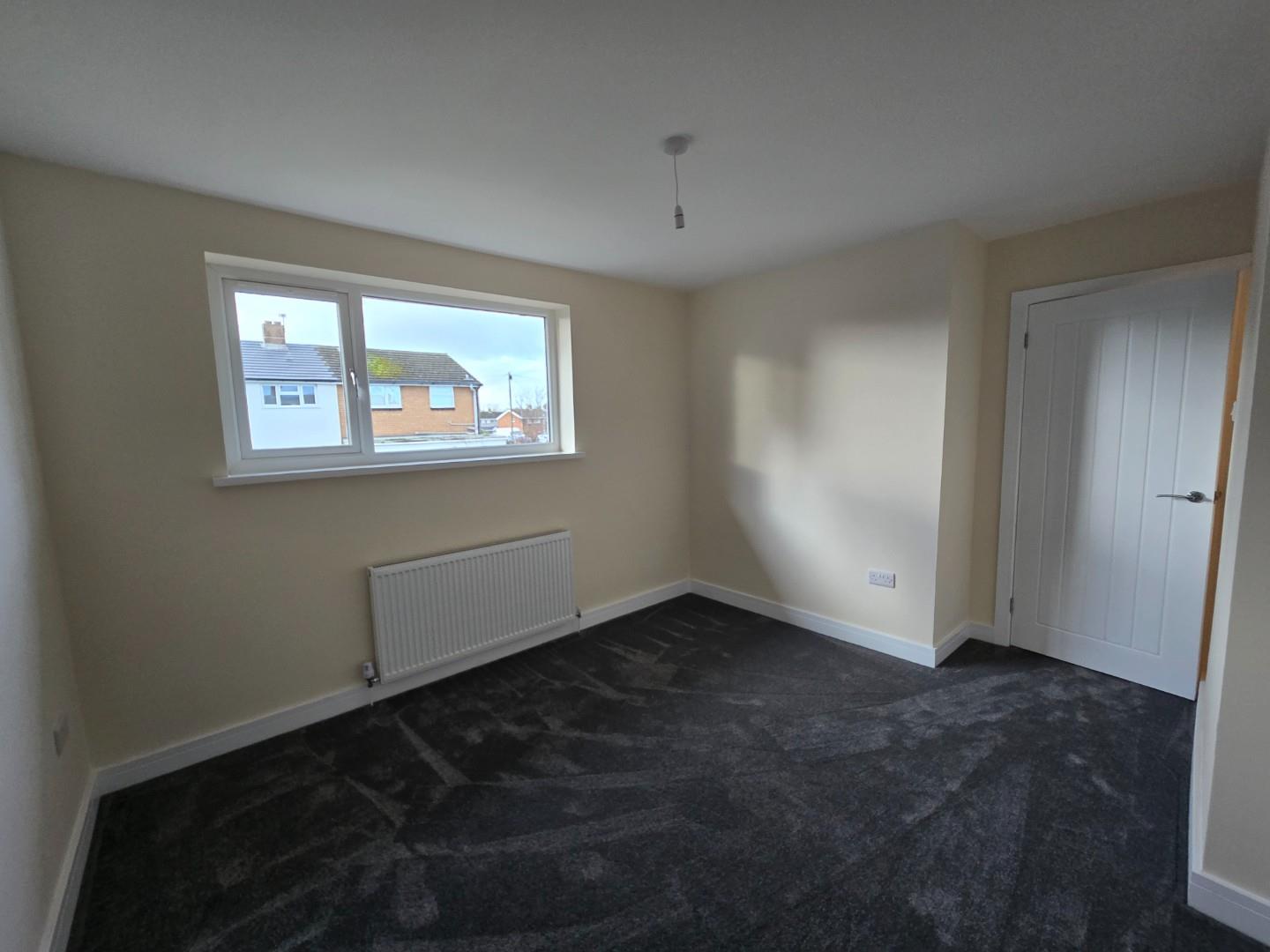 This bedroom is bright and spacious with neutral decor and a dark grey carpet. A large window lets in plenty of daylight while offering views of neighbouring houses. A radiator is positioned below the window, and a door leads to an adjoining space or hallway.