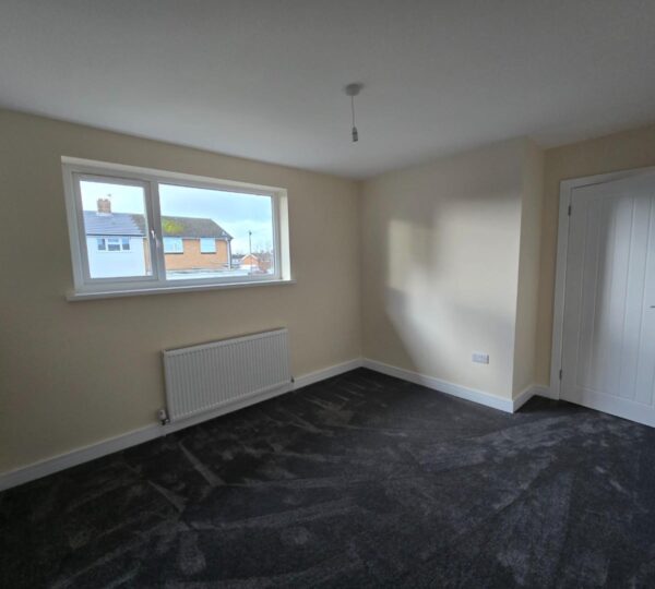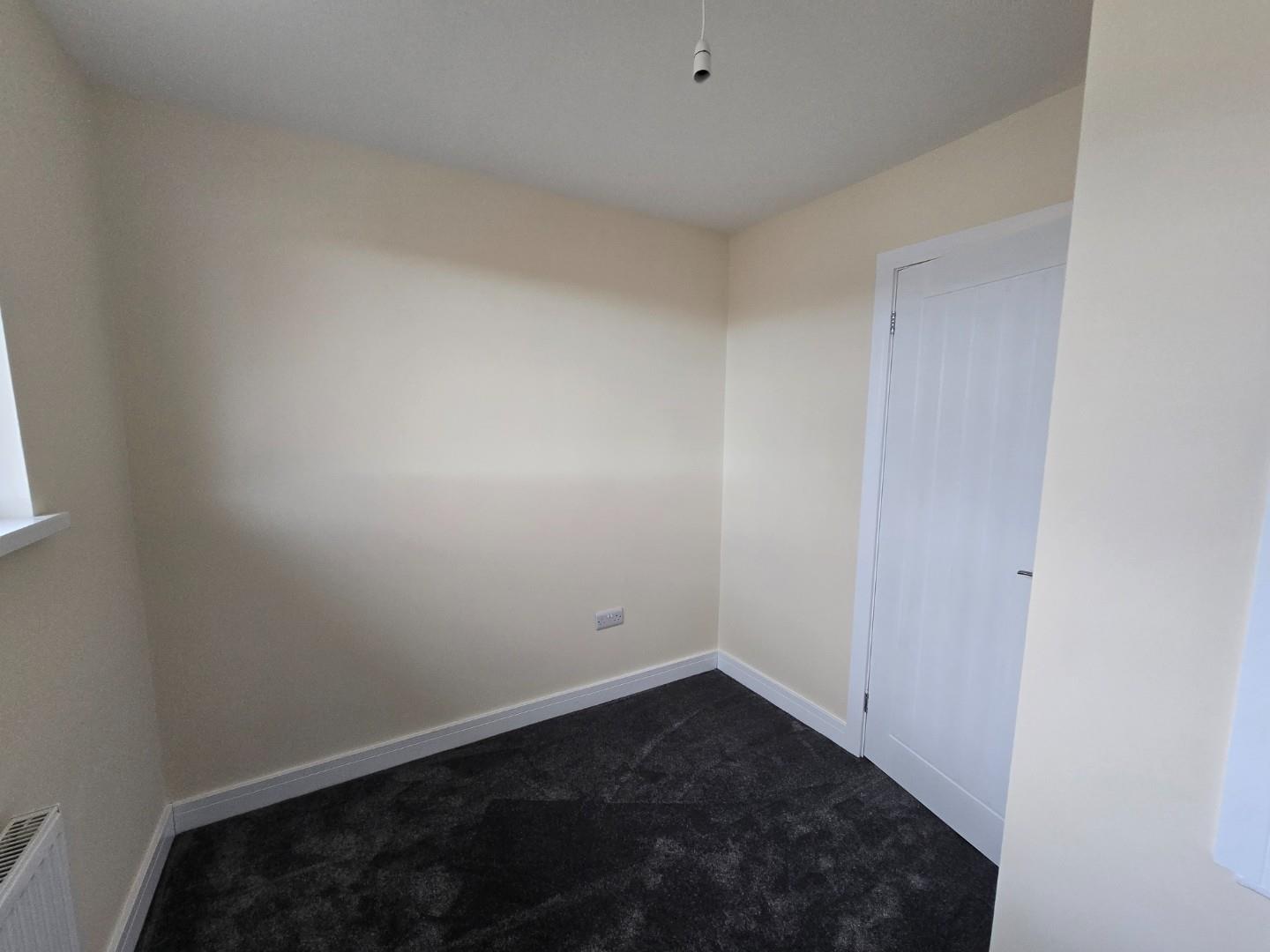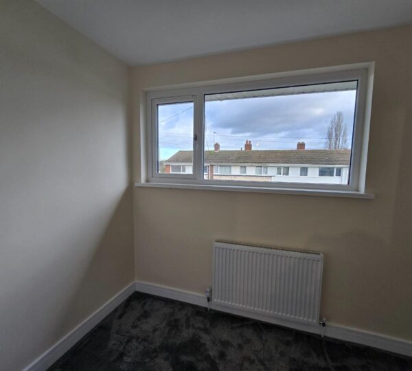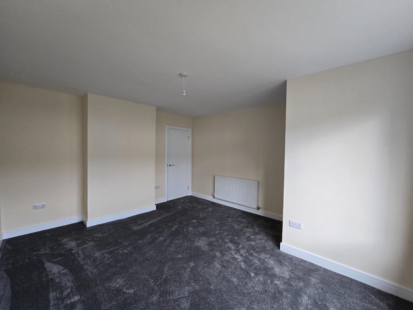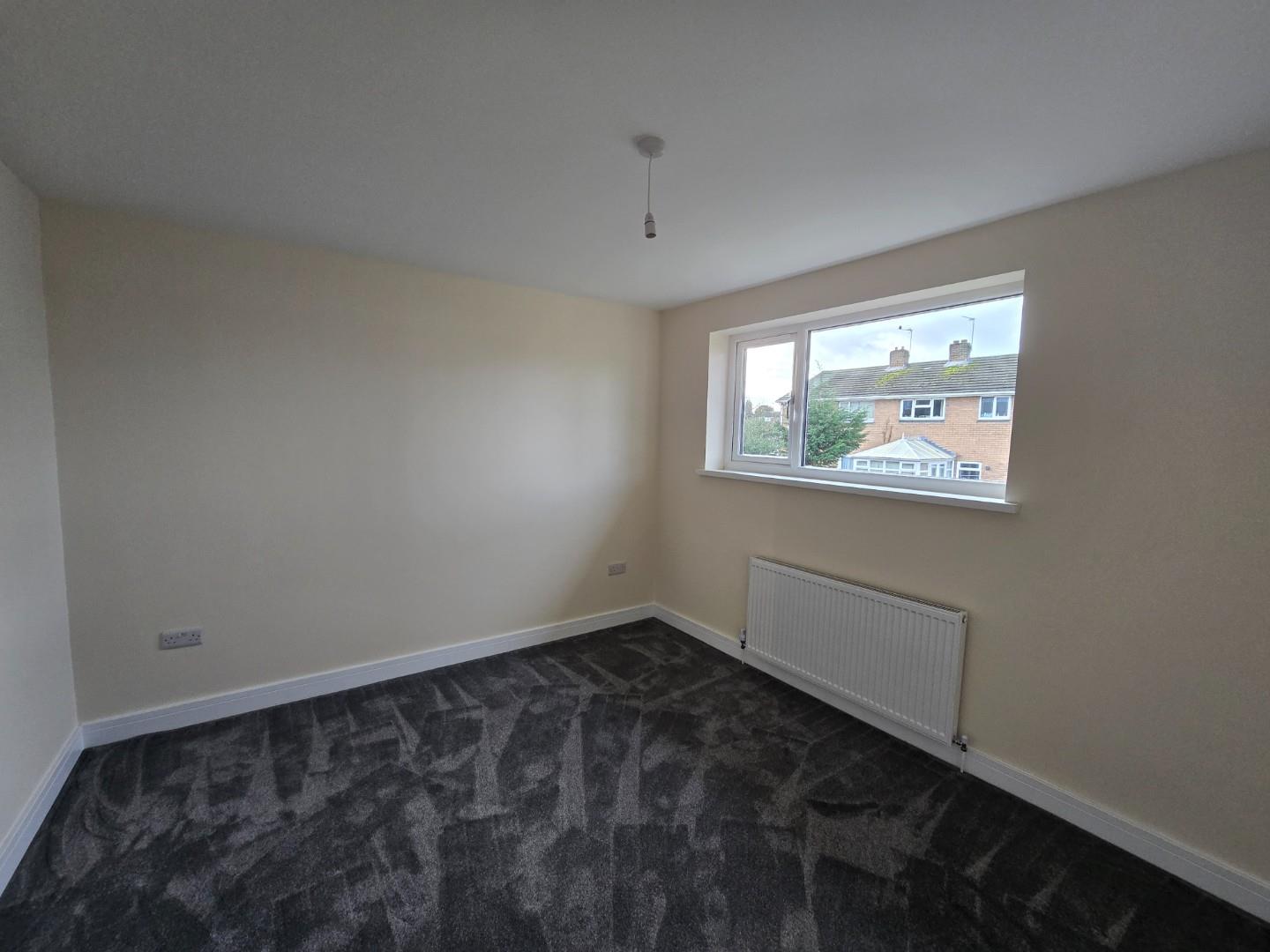 This bedroom is bright and spacious with neutral decor and a dark grey carpet. A large window lets in plenty of daylight while offering views of neighbouring houses. A radiator is positioned below the window, and a door leads to an adjoining space or hallway.