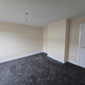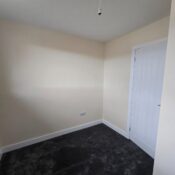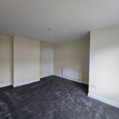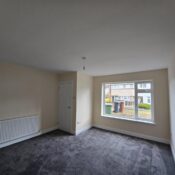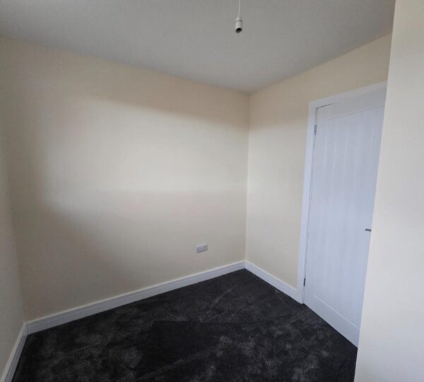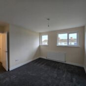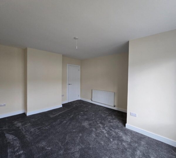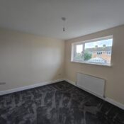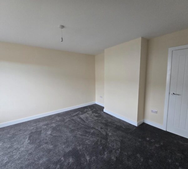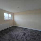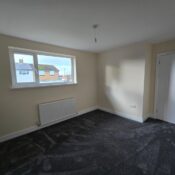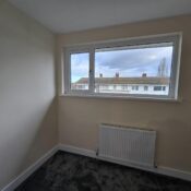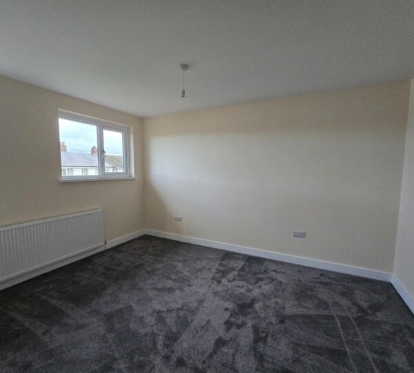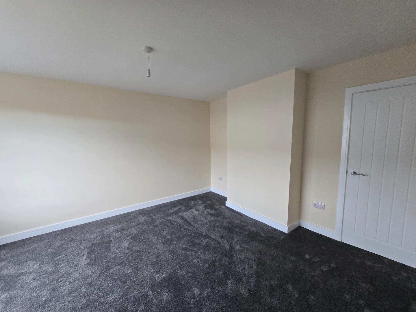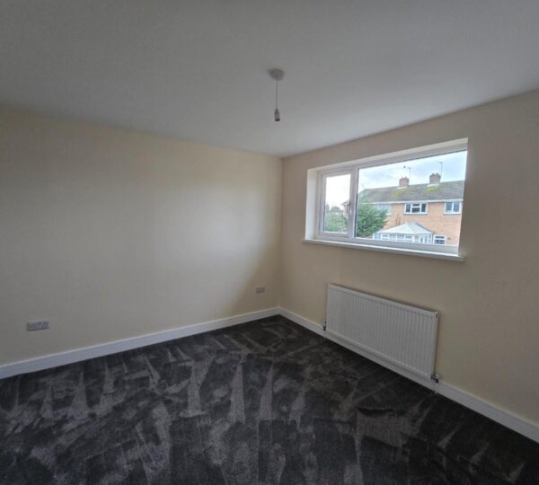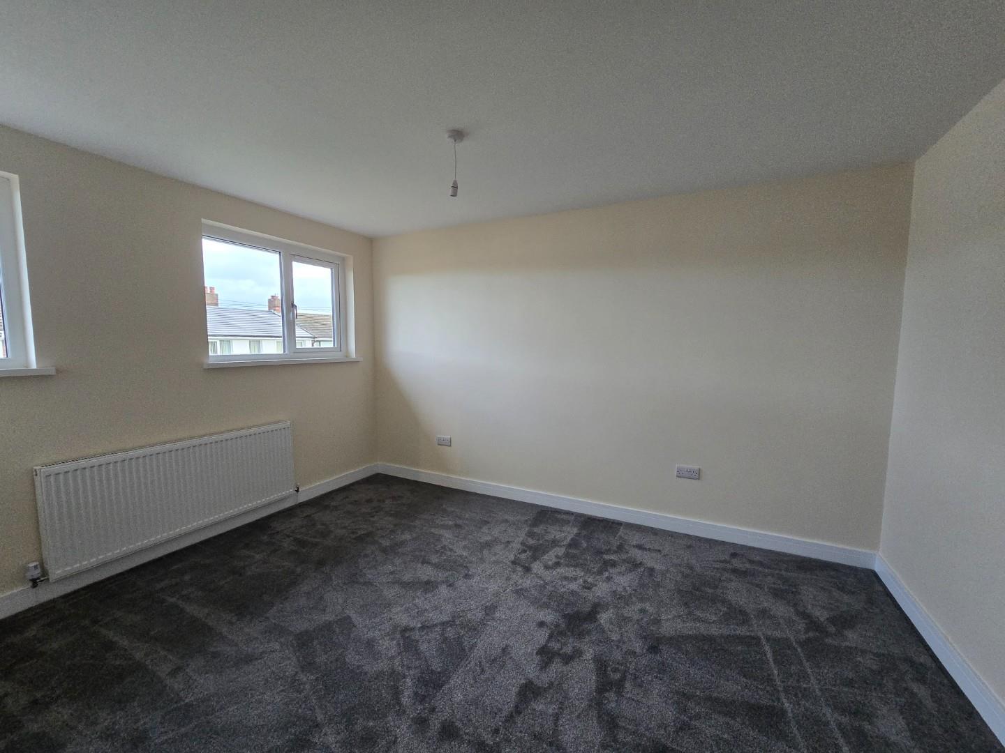 This bedroom is bright and spacious with neutral decor and a dark grey carpet. A large window lets in plenty of daylight while offering views of neighbouring houses. A radiator is positioned below the window, and a door leads to an adjoining space or hallway.