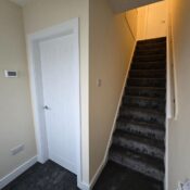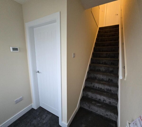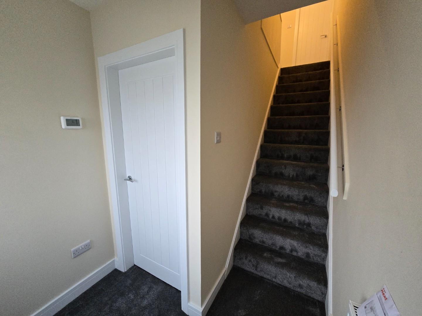 The hallway is a practical entrance space with neutral walls and flooring, leading directly to a stairway carpeted in dark grey, which ascends to the upper floor. A white door along the hallway offers additional access to an internal room or storage area.