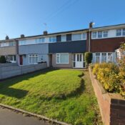 The exterior presents a traditional terraced home with a well-maintained front garden featuring a neatly trimmed lawn bordered by low walls, providing a welcoming approach to the property.