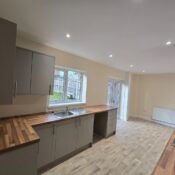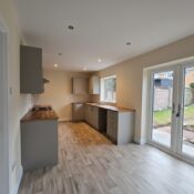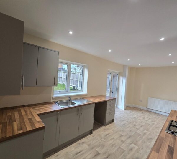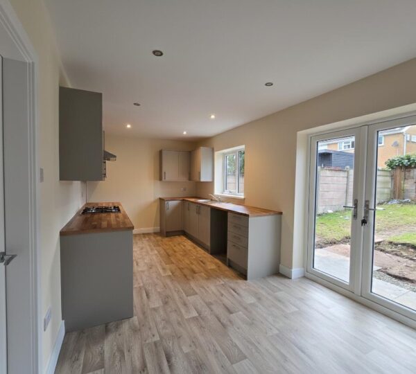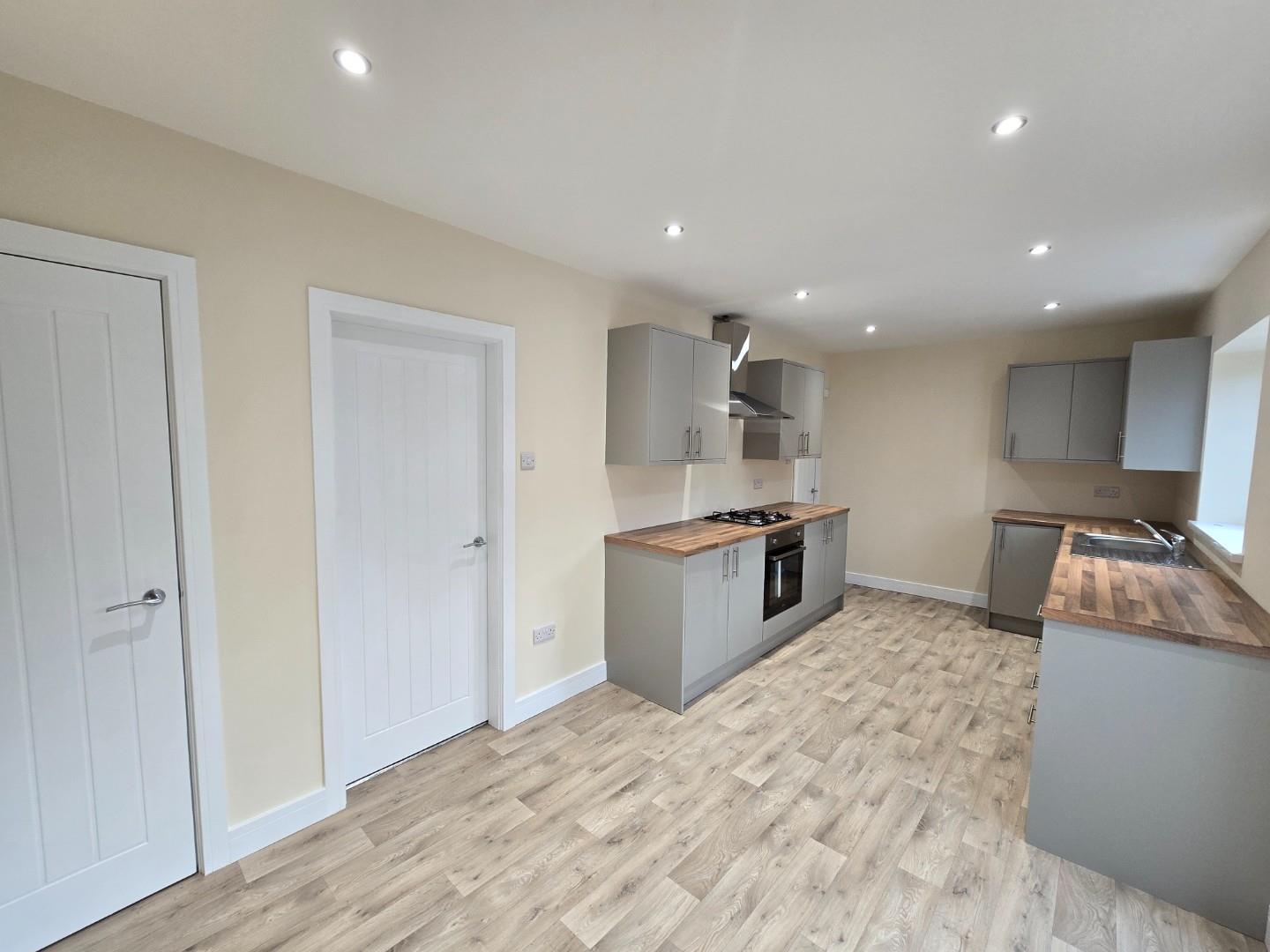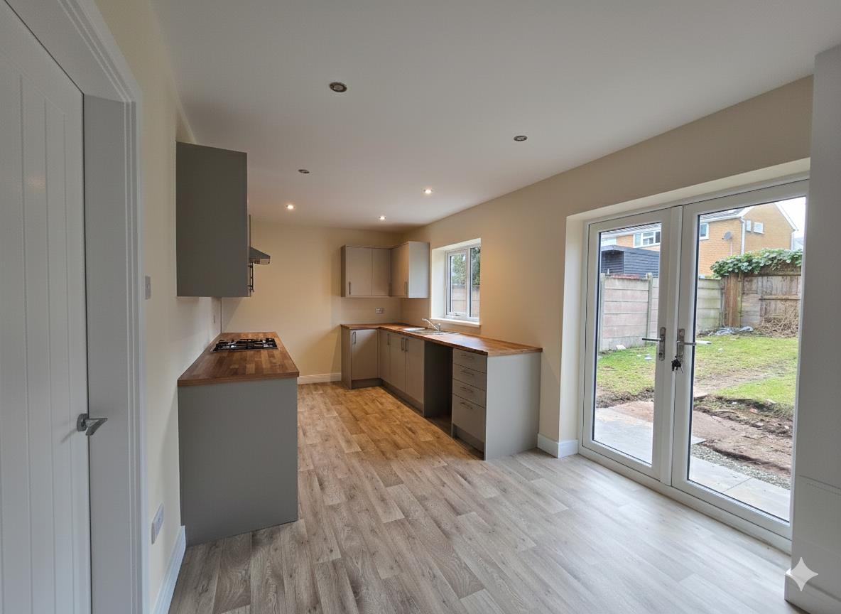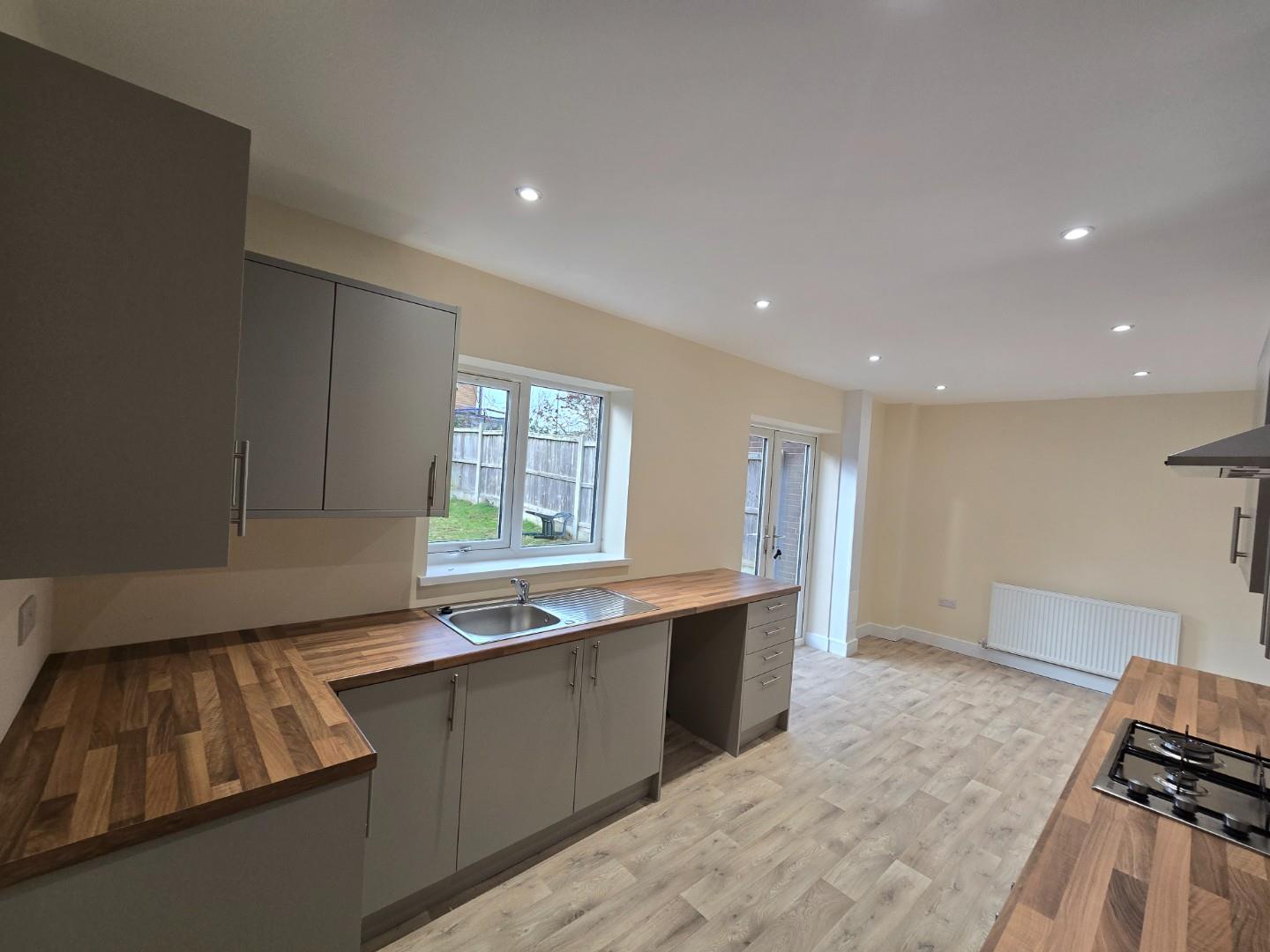 The kitchen is a bright and airy space fitted with modern grey cabinets and wood-effect work surfaces that provide generous preparation areas. The layout is galley style with a built-in gas hob and oven, and a stainless steel sink positioned beneath a window overlooking the rear garden. French doors open out to the garden, filling the room with natural light and offering convenient access to outdoor space. The floor is covered with a light wood-effect vinyl, complementing the contemporary yet cosy design.