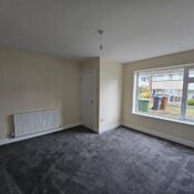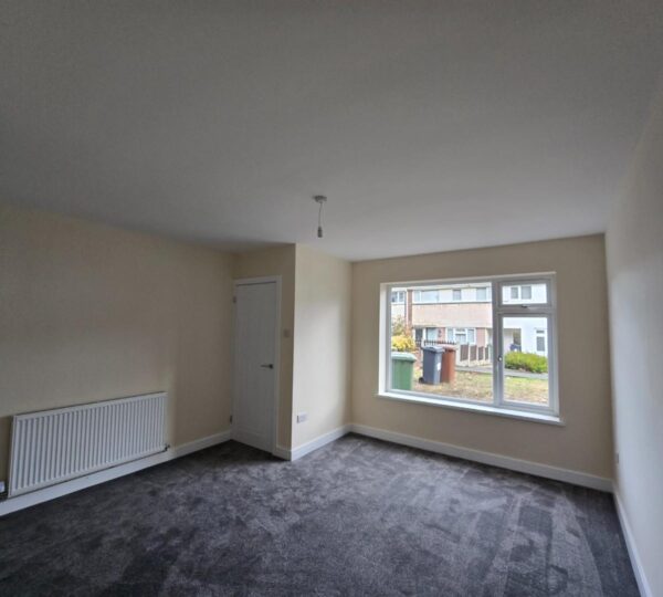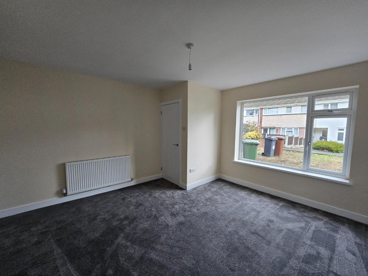 This room, likely the living room, is spacious and bright, featuring neutral walls and dark grey carpeting that adds warmth. A large window allows plenty of natural light and offers views of the front garden. A radiator sits beneath the window, and there is a white door leading to another part of the home.