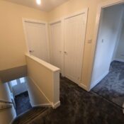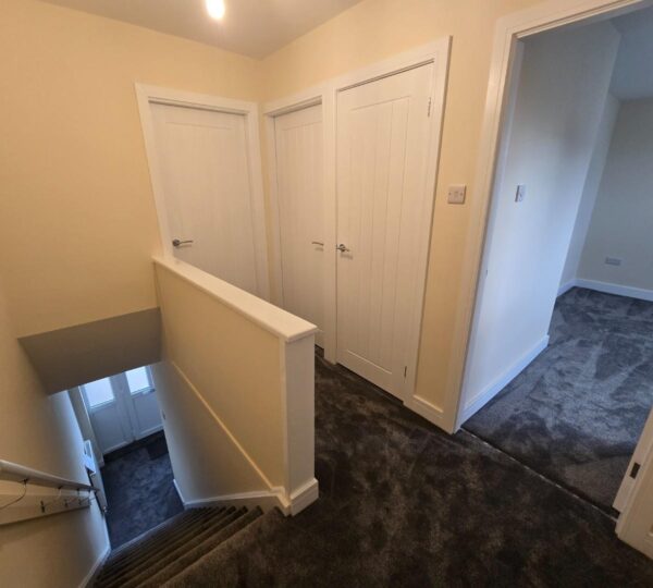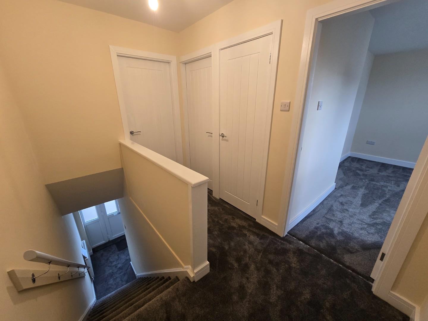 The landing is a compact, practical space at the top of the stairs with carpeted flooring and neutral walls. Doors lead off to several bedrooms and possibly a bathroom, while a half wall and stairwell provide an open feeling.